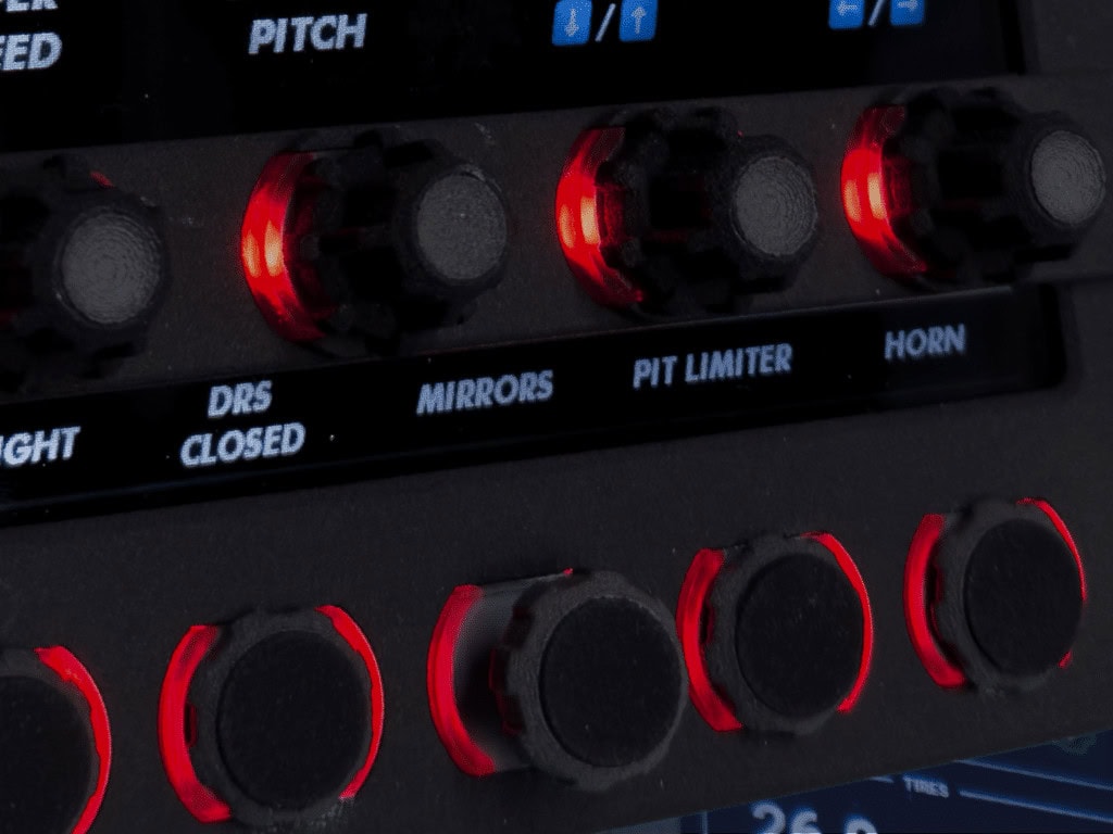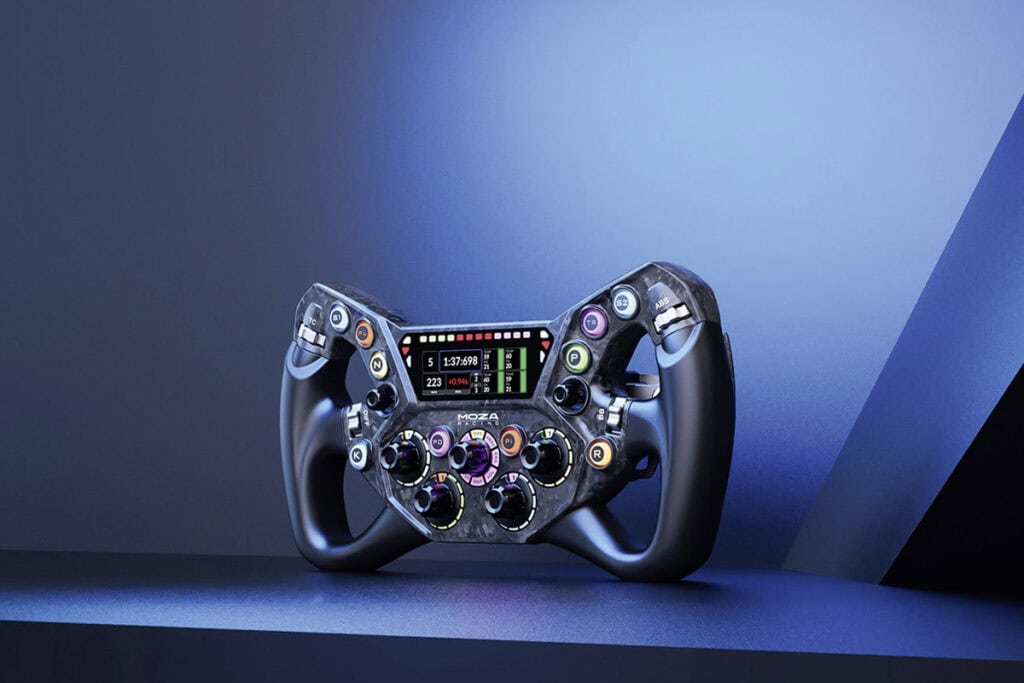 The 310 mm wheel is made of aluminium and features grippy Tactaris grips, magnetic shifters, seven rotary encoders, numerous buttons, and an integrated OLED display for live telemetry and tuning parameters. Functionality and design blend seamlessly here.