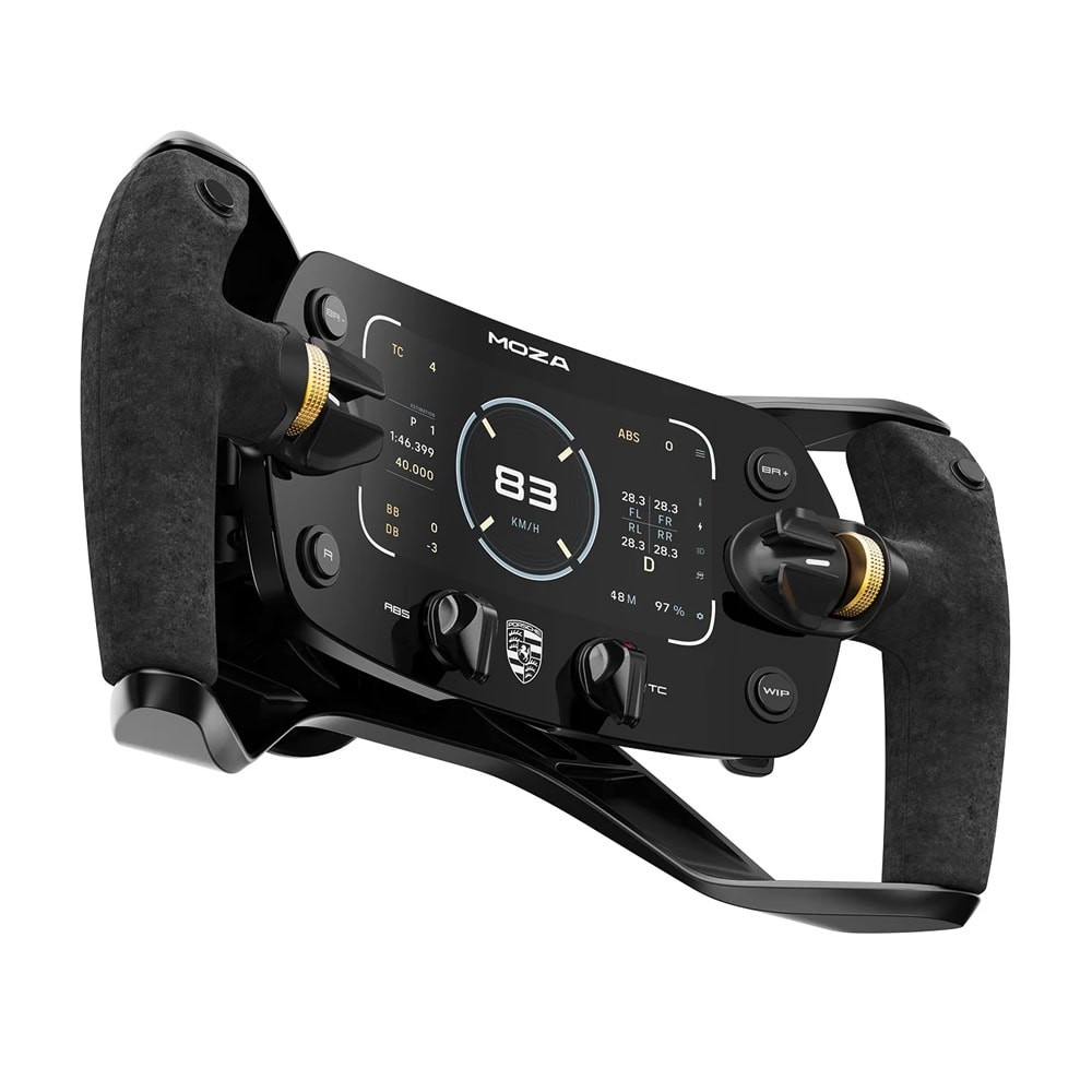 The MOZA Porsche Mission R Steering Wheel is an officially licensed replica of the original Porsche Mission R steering wheel and was manufactured using original CAD data. Equipped with a CNC-machined aluminum frame, a flexible 5.4-inch OLED display and customizable user interface, this steering wheel offers maximum comfort and precision. With 12 control elements, dual-clutch paddle shifters and the high-quality quick-release system, it is designed for professional simracers.